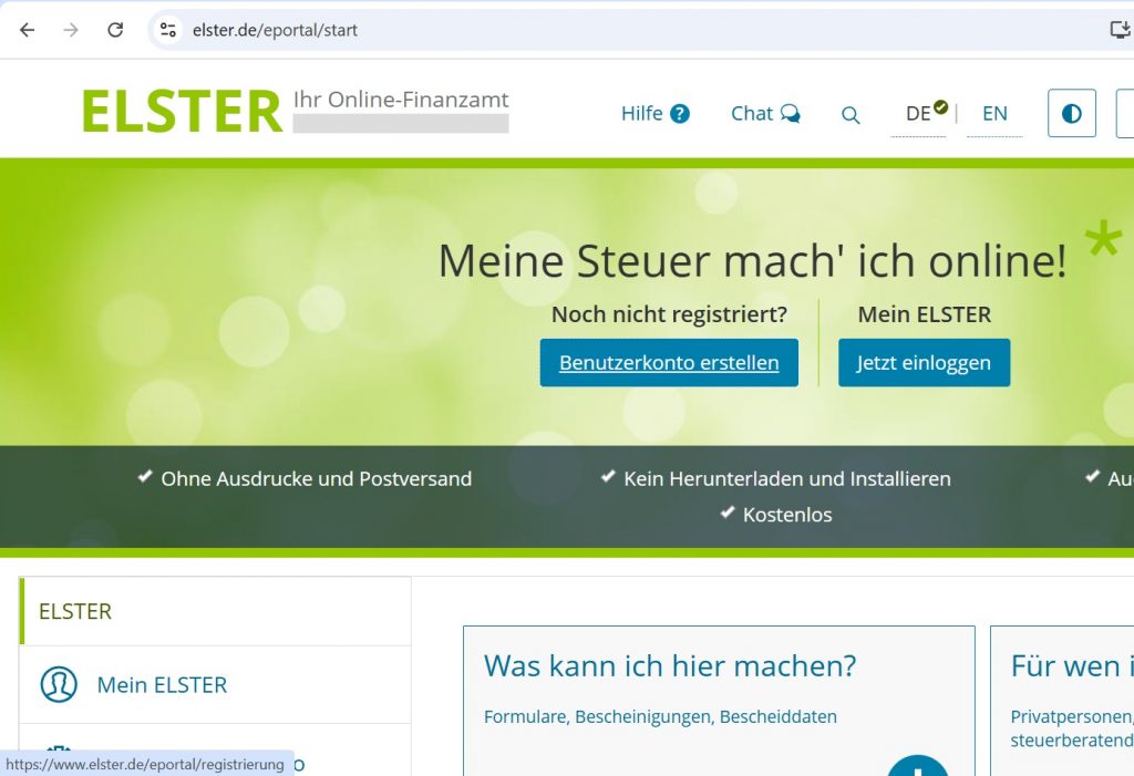 Jeśli nie korzystasz z usług kanzelarii podatkowej, będziesz musiał założyć konto w systemie ELSTER – to oficjalna platforma urzędu skarbowego do składania dokumentów, zeznań, EÜR itd. O tym, czym jest ELSTER i dlaczego musisz go mieć, przeczytasz tutaj.